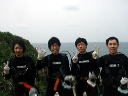 はいはーい!!ど〜も!りょーけんでっす!本日最後の体験は大学の友人同士でやってきたタクヤさん、ヒロキさん、トシカズさん、カズユキさんの4名のチーム敷田です!!全員ダイビングを経験済みということで水中ではとってもリラックスして泳いでましたね。自分の周りを魚達が囲んでくる中を洞窟まで泳ぎましたね。洞窟の中で入り口の青さを眺めていると感動しますよね。帰りにクマノミを眺めながら他の魚達にエサをあげましたね。まるで襲うように魚達が集まってきて驚きの様子(笑)その後ゆっくり泳ぎながら戻りました。次回沖縄に来たときはお店の前の砂辺の海で潜りましょう!! |