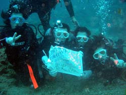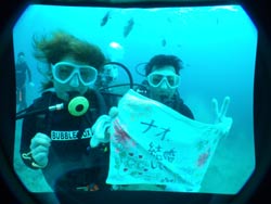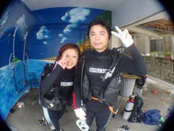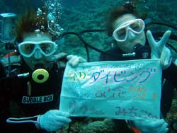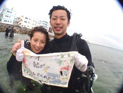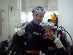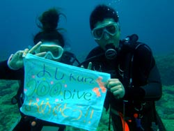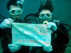 はーい!どーもーワンタンでーす!今日は砂辺で体験ダイビングをしてきました〜!遊びに来てくれたのはヒロさん!ナオさんでーす!!でも〜今日の体験は一味違いますよ〜!なんと!!ヒロさんがナオさんに水中でプロポーズをするという作戦があるのです!内容は〜先にハンカチを準備しといて〜ナオさんがそれを見て後ろを振り返ると〜OKですか??っという文字を準備しとくというものなのです!こっちも久し振りにドキドキしましたが〜潜れないと意味がないので・・しっかり練習はしましたね((笑))。でもそれで〜なんなくダイビングの方はクリア!潜れましたね!そしてニモの所へ向かい遊んでから作戦実行!ちょっと移動してソフトコーラルとたわむれながら〜さりげな〜くハンカチをアピール!!その瞬間ナオさんの目が見開き!!後ろを振り返ると〜スレートの文字がかいてありました!そして緊張の瞬間・・・。ナオさんから大きなOKの合図が!!!!!おめでとーー!!ヒロさーーんやりましたねーー!!うぁーーーぁーーーおめでとー!!!久し振りに大興奮でしたよ!その後も二人で写真を撮ったり、みんなで撮ったり!ちょっとは思い出に残りましたか??これからもヒロさん、ナオさんお幸せに過ごしてくださいね!また機会があればお店にも顔を出してくださいねー!まってますよーーー!! |