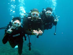 午後からの体験ダイビングは、、愛甲さんチーっムのお二人とです☆初めは若干緊張気味でしたが、ゆっくりゆっくり泳いで行って、綺麗な水中の中を見ると、スイスイと泳ぎはじめていましたね☆クマノミはたくさん卵を産んでいて子育てしていました!!1発芸のバブルリングもきれいだったでしょ?今度は、是非ライセンスを取得してくださいね〜☆もっともっと水中世界が楽しくなりますよ〜☆待ってまーす☆ |