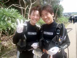 こんにちはー!!今日は砂辺で体験ダイビングをして来ましたー☆遊びに来てくれたのはライセンスを持ってるなつみさんと初ダイビングのだいすけさんです!!魚にエサをあげたりニモをみたり、天気もとてもよかったので最高でしたねー^−^是非ダイスケさんもライセンスに挑戦してみて下さーい!! |
