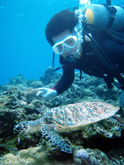 はいさーい!!今日は、昨日からのゲストさん、松本さんと一緒に、ケラマに体験ダイビングに行ってきましたよ〜☆昨日の成果もあってすんなりと水中のなかへ!!2本目に潜った時なんかは、カメが大量に出現して、カメ祭りでしたね☆他にも綺麗なサンゴの所に群れているお魚達や、キャベツサンゴもとってもキレイでしたね☆最後に潜った所では、サメに遭遇するなど、迫力満点のダイビングになりました☆また沖縄に遊びに来た時は、ぜひ海遊んでくださいね〜☆南の島で待ってますよ〜♪♪♪ |