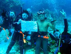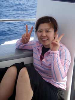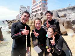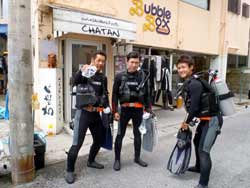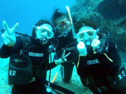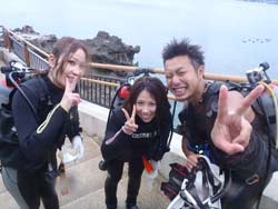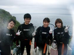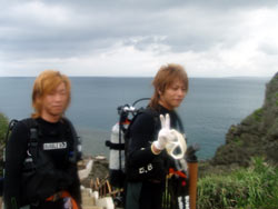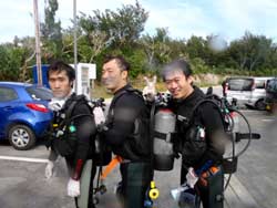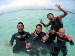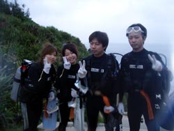 ハイサーイ! ども たくちんで〜す!!今日は、OWラストのチョンさんと、ヒョンさんと そのお友達の、ソさんの3人で、トモさんのガイドの下、真栄田岬へダイビングに行きました〜!!3人とも韓国の方です^0^しかも真栄田は、初めてということもあり、とても興奮していました^0^僕と ソさんに至っては、ビキニのお姉さんを見ながら・・・「いいですね〜」を連発^0^ まぁそんなこんなで・・・いよいよ!ダイビング!!青の洞窟へ行ったり、魚に餌付けをしたりして、の〜んびりと楽しく泳ぎました^0^途中でちょこちょこと、スキルの練習をしたりしましたが、皆さんとても上手でした!合計3回潜りましたが、皆さんずっと元気でした^0^そしてその後の、アフターでもとても盛り上がりすぎましたね^0^0^とても充実した一日でしたね^0^また次来た時は、一緒に潜りましょうう!!またきてくださいね〜. ではまた! |