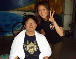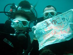 はいさ〜い!ども、りょーけんでっす!!今日は真栄田で体験ダイビングですよ〜。今回のゲストはJリーガーのユウちゃんとその彼女ナオちゃん!ダイビング初挑戦の二人を連れていざ洞窟へ!!最初はマスクに水が入ってちょっとあわてていたナオちゃんでし元気に泳ぎだしましたね。ユウちゃんの方は初めてとは思えないぐらいの落ち着きっぷりで最初から水中の景色を見てました。洞窟に入るとツバメウオの群れがお出迎え奥のほうまで行って振り返ると見えたのは青く染まった洞窟の入り口!!すごく綺麗でしたね〜。帰り道ではクマノミのイソギンチャクに触ってみたり、魚にエサをあげたりしましたね。ナオちゃんはエサに反応して群がってきた魚にかなり驚いてましたね(笑)また沖縄に来る機会があったら一緒に潜りましょう!! あっサインもらい忘れた(笑) |