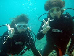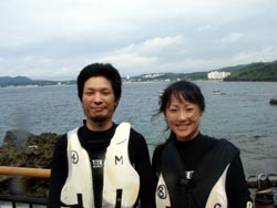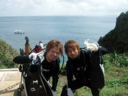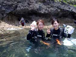 はいは〜い!!どっも、りょーけんでっす!!11時からは洞窟への体験ダイビング!!さてさて、今回のゲストは・・・ダイビング2回目でワクワクのみどちゃん!ダイビング初挑戦でドキドキのえっぴ〜!この二人を洞窟へごあんな〜い!!最初の水面でえっぴ〜が呼吸でドキドキしていたようですが、海の中に入るとバッチリリラックスして泳いでましたね。みどちゃんは余裕の表情でスイスイ泳いでました〜。洞窟に入る手前で水面を見ると細長いダツの群れが二人を歓迎!!洞窟の中では大きなツバメウオの群れが二人をお出迎え!!中に入って振り返ってみると広がるのは入り口の青!!すごくキレイでしたね〜。帰り道でクマノミを見たり、イソギンチャクに触ったり、魚にエサをあげたりと色々やりましたね。また沖縄にこれたら次はライセンス講習で会いましょう!!新しい趣味ができるといいですね(笑) |