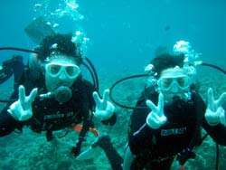 はーい!どぉーもワンタン^▽^♪今日は真栄田岬で体験ダイビングをして来ました!!メンバーはタカマツさんとムラカミさんでぇ〜す♪♪最初はドキドキしていましたが陸の練習と水面での練習で潜れるようになりましたね☆ゆっくーーり耳抜きをしながら降りてきて魚と遊びながら洞窟のほうまで進んで行きました。そしてぇ〜しばらくするとちょっと薄暗い穴に到着!!ここはまた違う雰囲気でドキドキしたでしょう〜!中に入るとでも青い綺麗な風景が広がってマイナスイオンがでてだでしょうぉ〜☆★☆日ごろのストレスはとれましたかぁーー??お二人ともとっても上手だったので機会があればライセンスも考えてみてくださいねぇ〜☆まってますよぉーーー |