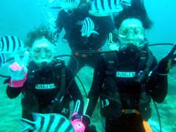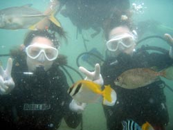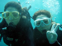 はいさーい!!今日は、おおどで体験ダイビングでした〜☆遊びに来てくれたのは、ナオちゃん&ミナエちゃんのお二人です☆二人とも初めてということで最初は、浅いところでゆっくりと練習をして海のなかへ☆水中に入ってみると、たくさんの魚が出迎えてくれましたね☆その中で魚にエサをあげたり、水中写真を撮ったり、バブルリングなんかもうまく見ることができました☆初のダイビングはどうでしたか??また機会があったら沖縄に遊びに来てくださいね〜☆南の島で待ってますよ〜♪♪♪ |