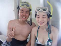 今日の体験ダイビングは去年も利用してくれた、ゆうくんとさっちゃん!今回も砂辺の海を満喫してきましたよ♪去年を思い出しながら、まずは陸上で説明&練習☆そして浅いところでもう一度復習♪さすが経験者!あっというまに水中へ!今回はちょっとレベルアップして自分で泳ぐ方法を伝授!! これまた、あっという間にスイスイ泳ぎ始めちゃいましたね!そこからはニモとニモジュニアに挨拶して柔らかサンゴを触ったり、ナマコをいじってみたり♪そして飛ぶように泳ぎながらサンゴのお花畑の上を泳ぎました!なんと来週に入籍するという2人!今回も水中でお祝いをしちゃいました!本当におめでとう!!!今年もレベルアップした、しげちゃんの一発芸でお祝い♪前回よりもたっぷり泳いでたっぷり遊んできました☆また来年も会えるのを楽しみにしてるね!これからも仲良く、そして幸せにねーーーー♪ |