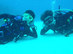 今日朝一で遊びに来てくれたのはダイビング初挑戦!!かっちゃん&3回目のベテラン?!かずくんです♪最初は呼吸のペースが難しかったようで多少の苦戦はあったものの・・・すぐに慣れて水中では周りをキョロキョロしていましたね!!洞窟内もあまり人がいなくのんび〜り青い光を眺めてたっぷ〜りいやされました(。^^。)2人ともカラフルで可愛いお魚が好きなようで☆お魚にご飯をあげてる時は少年の顔になってましたね♪大きい魚が来た時はビックリしていましたが(><)自由にいっぱい泳いで楽しんでもらえたかな?!次回はぜひ皆さんでライセンス取得に挑戦してみて下さいね〜!! |