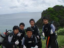はいは〜い!ど〜も〜りょーけんでっす!!今日は真栄田で体験ダイビングですよ〜!今回のゲストは飛び入りで申し込みしたユウスケ!シュウスケ!ダイスケ!ヨシヒロ!ショウタ!ユウキ!トオル!タカユキ!の8名を連れて青の洞窟までいってきました〜。メンバーの約半分がダイビング経験者でしたが、未経験のメンバーもすごく落ち着いて潜っていて顔をつけた段階から水中の景色を見渡してました〜。スイスイと泳いで進んでいくとあっという間に洞窟の入口に到着!!奥まで行って振り返ると目の前に広がるのは入ってきた入口の青!!一面に広がる青を見ながらちょっと休憩して帰り道ではクマノミを見に行ったり、魚にエサをあげたりして遊びましたよ〜指ごとエサを奪おうとする魚達にちょっと驚いていましたね(笑)最後にバブルリングも成功してダイビング終了!!また沖縄に来る機会があったら次も一緒に潜りましょうね〜。まだまだ楽しいところはたくさんありますよ〜!! |