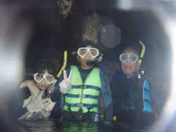 はいはーい!ど〜も!!りょーけんでっす。今日は真栄田でスノーケルですよ〜!!今回のゲストはリオ!ノアちゃん!じぃじ!の3名。入る前はちょっと雨が降っていましたが、泳いでいるうちにあがってしまいましたね。下を泳ぐ魚たちを見ながら進んで行くとあっという間に洞窟の入口に到着!!中に入ると真っ暗な水中を泳ぐツバメウオを見ながら洞窟の奥へ・・・折り返して洞窟の一番青い所に行くと天井まで真っ青に染まった光景が!!ゆっくりと記念撮影をして、いざ帰り道!!洞窟をでてからはクマノミを見たり、魚にエサをあげたり、年賀状用の写真撮影をしたりと色々遊びましたね。今回は飛行機に乗る関係でスノーケルでしたが、次回沖縄に来る機会があったら今度はダイビングで洞窟まで行きましょうね!! |