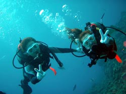 今日の体験ダイビングは青の洞窟へ行ってきましたよ!!参加者はゆうこさん率いるうちなんちゅガールズ!いっちゃん・あこちゃん・ちぃちゃんです♪陸上で呼吸や耳抜きのコツを覚えて足の届く水面でも練習!ちぃちゃん、初めは苦しい・・・って言ってたけど、「練習、練習♪」って言いつつ、いつの間にか水中に入ってました♪あとはみんなで洞窟を目指し スイスイと泳ぎました☆洞窟は真っ暗だったけど 振り返ると青くきれいな世界が広がってました!帰りはクマノミを観察したり魚にエサをあげたり、たくちゃんの一発芸を披露したりと沢山遊べました☆うちなんちゅダイバーが増えるのを楽しみにしてるよ!ね!いっちゃん!!また一緒に潜りましょうねーーーー♪ |