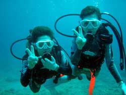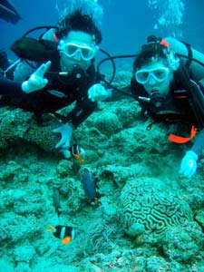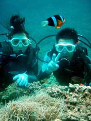 こんにちはーーー!!なすびです!!今日はマエダ岬で体験ダイビング!!遊びに来てくれたのは鹿児島出身の龍也君&あいちゃん★2人ともとにかくダイビングがしてみたいと言うことで体験ダイビングに挑戦でーーす^−^たくさんの魚に囲まれながら蒼の洞窟に向かって行って来ました!!蒼の光すっごいキレイでしたねーー♪クマノミを目の前見たり魚にエサをあげたり、さんぺーおじさんのバブルリングもすごかったですねーー☆最後の階段で2人ともヘトヘトでしたが楽しんでもらえましたかー??また遊びに来て下さいねーー!! |