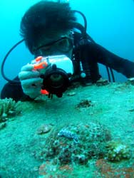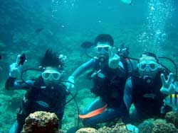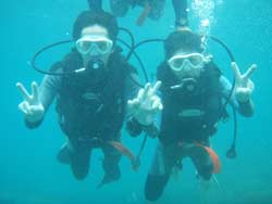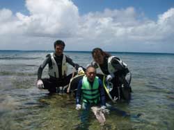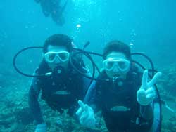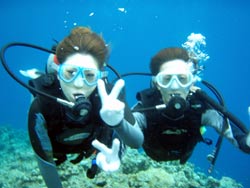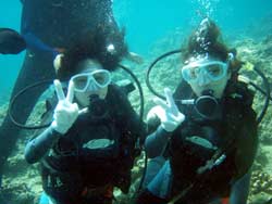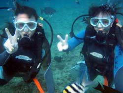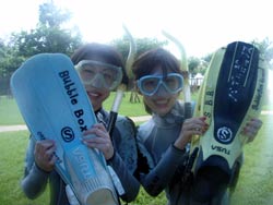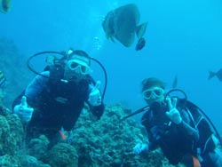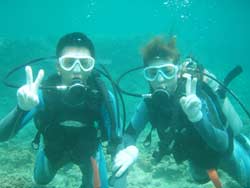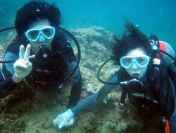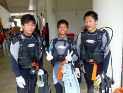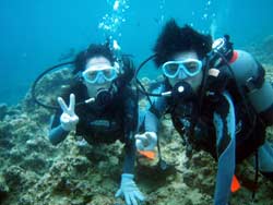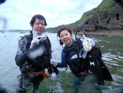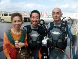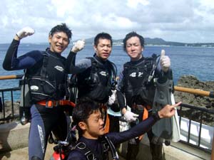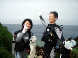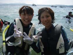 はーい!どーもワンタンでーす☆今日は真栄田岬で体験ダイビングをしてきましたよ〜☆参加してくれたのは、いつもBBにきてくれているイクちゃんと今日は初のダイビングのしんさんでーす☆海遊びはスノーケルもやっているという事だったのでやっぱりとっても上手でしたね☆足のつく所での練習はほとんどのスキルが1発OK!!海の中に実際に入ってみてももっと落ちついていてびっくりしましたよ〜☆魚や風景を見ながら洞窟まで行き薄暗い洞窟の中へ魚の群れや振り返るとそこには蒼い光がまっていましたね☆帰る時には1人泳ぎに挑戦!!見事に泳げましたね☆魚にご飯をあげたり、1発芸のリングがうまく行って良かった〜!!(笑)今度はしんさんライセンスコースでお待ちしてますよ〜☆ |