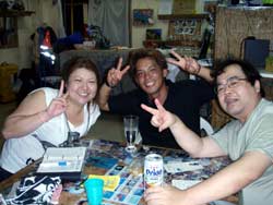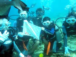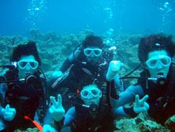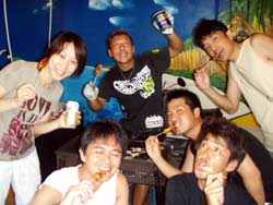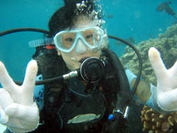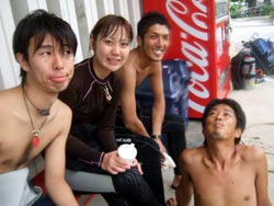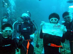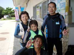 はいはーい!!ども!りょーけんでっす。今日は真栄田で体験ダイビングですよ〜!今回のゲストは、お父さん!お母さん!きーちゃん!ゆうくん!の4名!!ダイビング初挑戦の4名を青の洞窟まで案内してきました〜。潜る時はみんな普通に潜ることが出来たけどちょっとお母さんが恐くなったりしましたが、なんとかがんばって洞窟へ!!洞窟の中では子供達はスイスイと泳いで奥の方へ・・・お母さんとお父さんは手前で入口の青を見てましたね。帰り道ではクマノミを見たり、魚に餌付けをして遊びました〜!!そして!!明日誕生日のゆうくんをお祝い!!水中でハンカチを渡して記念撮影!!ばっちり撮れてダイビング終了!!また沖縄に来る機会があったらまた一緒に潜りましょうね!! |