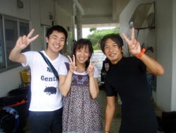はいはーい!ども〜。りょーけんでっす!今日は砂辺で体験ダイビングをやってきましたよ〜。今回のゲストはお兄ちゃんの応援にやってきた兼子ファミリーのお父さんとユウジくん!この2人に砂辺の海を案内してきましたよ〜!お父さんが最初耳抜きで苦戦していましたが、コツを掴んだらスイスイもぐれましたね。ニモを見たり、柔らかいサンゴのお花畑に行ったり、と色々と泳ぎ回りましたね〜。魚に餌付けをしたときは魚に近さに結構驚いてましたね。最後にバブルリングも成功してダイビング終了!!これから始まるインターハイの応援頑張ってください!!また沖縄に来る機会があったら、次はライセンス講習で潜りましょうね〜!! |