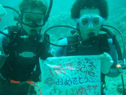 こんにちはーー!!なすびです!今日はマエダ岬で体験ダイビング♪遊びに来てくれたのは大阪から初ダイビングのサトシさんとライセンスを持っているユキさん!!Dコースということでガッツリ2本潜ってきましたーー!!まず1本目は洞窟に向けて練習っっ!!!!さとしさんは初ダイビングということでしたがとても上手でしたね^−^クマノミを近くで見たり魚にエサあげたり楽しかったですねーー!!!2本目もバッチリ洞窟でキレイな蒼を見てきました★2本目の最後には2人の一周年記念とユキさんの100ダイブのお祝いをしてきましたーー!!おめでとーー!!!また遊びに来てくださーい!! |