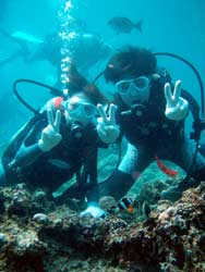 ハイサイ 今日のスペシャル体験ダイビングに 参加してくれたケイスケくんとスズヨちゃんです。二人は 以前体験ダイビングをやった事あり 2度目のダイビング なんとスズヨちゃんは内地で講習途中だそうです。今回のスペシャル体験ダイビングは ちょっとしたコツを練習まじめから 二人ともスイスイと泳ぎはじめ 肺の使いかたなどなど 泳ぎもとっても上手です。餌付けでは 一生懸命魚を捕まえようとしていましたが・・・生のニモに会いその後水深ー12mへゆっくりと水面を見ていると なんと鯖科のグルクマが 口を開けて近くまで そして空飛ぶようにお花畑へ 水中ビデオを撮影したり 写真もちゃんと 取れていたかな?浮き沈みを楽しみながら帰っていると なんと いわしの仲間の大群が 何万匹いただろうか?辺りが暗くなるほどの大群ゆっくり 堪能できました。その後 小さな穴を探検しながら 帰って来ました。いや〜ダイビングって楽しいですよね。ライセンスゲットして もっともっと 海を探検してくださいね。また 沖縄の青い空で待ってるよ! |