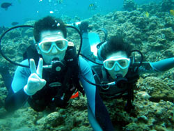 朝一で体験ダイビングをしに来てくれたのは去年も遊びに来てくれためぐちゃん&ダイビング初挑戦のやすくんです!!めぐちゃんは前回、耳抜きが出来なかったらしくお家で練習をしてくるくらいやる気満々?!でも大丈夫かなぁ><と不安も漏らしていたね。。。やすくんは初めてなので緊張気味。。。でも2人とも水面で練習してみると意外と普通☆笑 耳抜きもだんだん慣れてきて水中ではず〜っとニコニコ笑ってましたね〜♪めぐちゃん笑いすぎて呼吸器ポロポロしていましたが(><) それでも余裕のめぐちゃん!!もうライセンス取っちゃえ!!笑 一緒にニモの仲間のクマノミ&ハナビラクマノミを見てイソギンチャクを触ったりお魚にご飯をあげたりとっても楽しかったね♪でもいっぱい泳いだけどまだ足りないみたい(^^) 2人ともとっても上手だったので次回はぜひライセンスコースに挑戦してみてね〜!!来年?!お待ちしてま〜す!! |