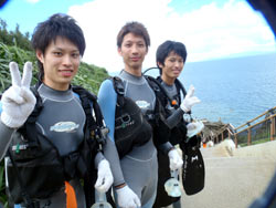 こんにちはー!!なすびです!15時からは大阪から遊びに来てるさとし君・かずや君・むねひろくんがダイビングに挑戦でーーす♪魚にエサをあげたりクマノミを見たり楽しかったですねーー☆みんなとてもうまくて自分達で上手に泳ぎ回ってました!!洞窟も蒼くてすごく綺麗でしたね★三人ともすごく上手だったので次は是非ライセンスに挑戦してみてくださーー^−^ |