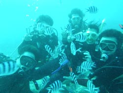 はい!どーもーワンタンでーす!!今日は砂辺でビーチ体験ダイビング!一緒に潜ってくれたのは〜いつも来てくれている黒ちゃんとそのお友達のハダさんと〜キヨタさんでーす!!キヨタさんは3回も体験ダイビングをしているので練習も楽勝(笑)。ハダさんは1回しかやったことがなかったので、説明のときには心臓バクバク!!それを面白がっている黒ちゃんでした(笑)。魚をみながら練習をしたのでバッチリ潜れましたね!!ソフトコーラルを触りながら泳いで行くと〜ニモがいましたね!!三人のイソギンチャクの触り方がいやらしい事いやらしい事(笑)。その後いやらしい貝を見たり、魚にエサをあげて見たりたくさん遊びましたね!次回はライセンスでも挑戦してみてはいかがですかぁ?待ってますよー!! |