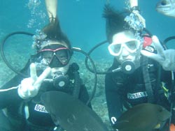 はい、どうも〜!タクでーす!!今日は、砂辺で体験ダイビングでーすよ^0^来てくれたのは、東京の看護婦さんのお2人!チヒロさんと、アカネさんでぇーす!!2人とも初めてということでしたが、最初から盛り上がっていましたね〜!練習もスムーズに進んで、海へレッツらゴー^0^浅い所で顔をつけるとすぐに小魚が寄ってきました。ちょっと沖まで行くと、いつの間にか魚に囲まれてしまいましたね。そして最初は、ニモへ挨拶に行きました!チューはしてくれなかったけど、またリベンジしよーね^0^次はやわらかいサンゴとたわむれて、お花畑へ!!一面に広がるサンゴは素晴らしかったね〜!!帰り道では、エサあげをしました〜。動画を撮っても、魚・魚・魚(笑)写真を撮っても、魚・魚・魚(笑)見事な食われっぷりでした^0^でも何よりも一番だったのは、2人の顔が面白かったです^3^また今度は暑い夏のOKINAWAで、お待ちしてますよー!以上タクちんでしたー、ばいちゃ!! |