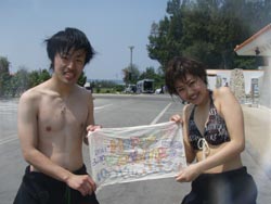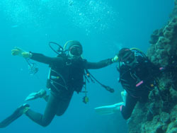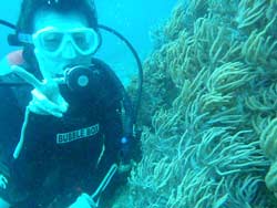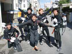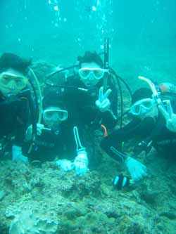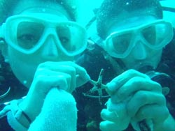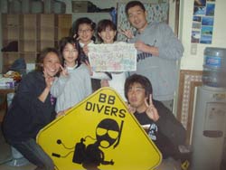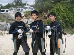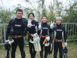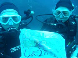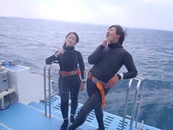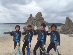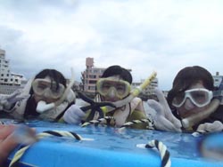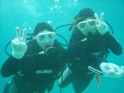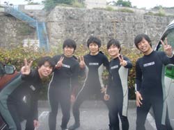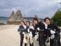 はい!どーもーワンタンでーす!今日は崎本部にあるゴリラチョップで体験ダイビングをしてきました!!一緒に潜ってくれたのは〜えりちゃん!あさみちゃん!りえちゃん!あゆみちゃんでーす!!四人とも初めてだったので陸の説明のときから真剣に聞いてくれました!!そのおかげできれいな海の中にすぐに入ることが出来ました!ヒトデを見つけたり、ニモの親戚のクマノミもいたし、イソギンチャクの感触も海の中にしかないのでいい想い出になったと思います!最後の一発芸も決まったしね(笑)。次回はボートに乗ってウミガメにでも会いに行きましょうか!!その日まで南の島の沖縄で待っておりますよ〜!!今日はありがとうございましたぁー☆ |