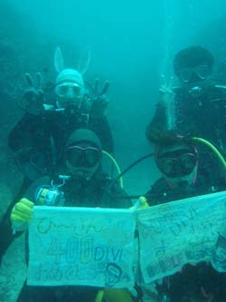 はいはーい!ども、りょーけんでっす。今日は体験ダイビングに行ってきましたよ〜!今回のゲストは昨日に引き続きのユウカちゃん!!マンツーでケラマへあそびにいってきました〜。まず1本目はドラゴンレディー!一面に広がる砂地をゆっくりと泳いでいつものスカシの根で手をエビにクリーニングしてもらいました。続いての2本目はトウマ西へ!岩場と砂地の間をグルグルと回ってガーデンイールを見に行ったり、ヒトデやナマコで写真を撮ってみたりと色々遊んでみました!お昼を取っての3本目は座間味からちょっと離れてアリガーへ!!ここではカメを探してちょっと遠くまで泳いで見ましたが・・・残念ながらカメが出てきませんでした(汗)その代わり何故か大量にいたグルクンの群れに突っ込んでみたりして遊びました!行き帰りでちょっと波が高かったのでちょっと酔ってしまいましたが、止まっている間はまったく揺れなかったので快適なダイビングが出来ましたね!また沖縄で一緒に潜れる日を待ってますよ〜!! |