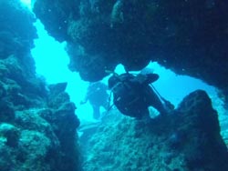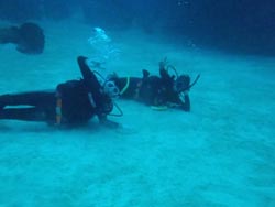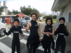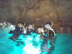 はいはーい!ども、りょーけんでっす。今日は体験ダビングに行ってきました〜!今回のゲストはヨシヒロさん!トモヨさん!リョウセイくん!ミッキー!の4名!!今回海が荒れていたのでボートで青の洞窟へ行ってきました〜。全員陸上での練習はバッチリだったので、すぐに水中に潜ることが出来ましたね!途中で耳抜きがちょっと上手く出来なかったところもありましたが、全員水中で集合することが出来ました!写真を撮りながら洞窟まで泳いで行くと・・・。真っ暗な洞窟の奥まで行って振り返ってみると真っ青に光る入り口が見れましたね!帰り道では魚に餌づけをして遊んでみました。目の前で自分の手からエサを食べる魚達をゆっくりと見てましたね!また沖縄に来る機会があったら次は暖かい夏の沖縄で一緒に潜りましょうね!! |