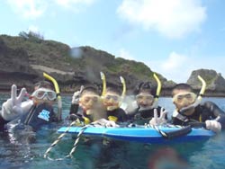 はいさ〜い♪♪今日、飛び入りで参加してくれた藤本さん一家と、スノーケルに行ってきました!天気も変わらず、最高でした^0^海へ入ったら、さっそく子供たちは自由行動(笑)でも名前を呼んだら、「はい!」っと、元気な返事をしてました。魚たちと一緒に泳ぎながら洞窟へ向かい、中へ入ったらしっかり右を見て、奥へ。壁沿いに進み、振り向くと歓声が上がってましたね!洞窟を出てからは、エサあげをしました。皆は夢中になりすぎて、やっぱり自由行動(笑)でも返事は同じく、「はい」っと、ハキハキしてました^0^最後は、一発芸!!面白かったかな??(笑)次回は皆でダイビングに挑戦してみては?!待ってますよ〜!今日はありがとうございました!!! |