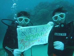 はいさい!トモです。今日は九州大分から、新婚さんいらっしゃ〜い!浜田さん夫婦のお笑いコンビ、タカ&トシのタカ似のけいすけ君と、とってもお茶目な可愛いゆうきちゃんです。今回初めてのダイビングという事で、しっかりと説明で陸での練習!がっつりと潜りたいと言う事で、特上スペシャルCコースです。浅瀬での練習でゆうきちゃんは少しドキドキしていましたが、旦那のけいすけ君は、さすが漁師の子!最初から上手かったので驚きました。浅瀬を進みドロップを降り二人とも耳抜きも問題なくその頃にはゆうきちゃんもすっかり慣れてきたので、1人で泳げる説明と練習をしておいたので、すっかり泳げるようになっていましたね!!餌付けでは、顔が見えない程魚が寄って来てましたがムービーちゃんと撮れてたかな?その後はニモに会いに行きました。赤ちゃんクマノミが居て可愛かったね。一緒に記念撮影をしたあとは、新婚おめでとうサプライズです。なんだかとっても仲良し夫婦で羨ましかったです。大丈夫そうなのでー12mまで潜りバブルリングを披露!泡のリングがぐんぐんと水面に向かうのがとっても綺麗でした。天気もよく最高だったね〜。まだまだ続くCコース!その後、サンゴのお花畑へ!!柔らかサンゴが満載のポイントでのんびり泳ぎました。光りも入りムービー結構いい感じで撮れてたのでは?大分に帰ったら友達に自慢してね〜!結構水中写真もたくさん撮ったけど、いいのあったかな?おれはヒトデを二人で持ってるのとか良かったんじゃないかな?フワフワ二人で中層を泳いでるのもよかったかな?沖縄の一番の思い出になってれば最高です。その後バイクレンタルで古宇利大橋行ったのかな?また、沖縄遊びに来てくださいね。待ってますよ!! |