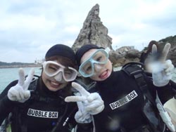 今日はダイバーが誕生しましたよぉ♪東京都よりふくちゃん!!初日・2日目は北風ぴ〜ぷ〜の中、寒い寒い(><)と嘆きながらも、しげちゃん&りょうけんとスキルをマスター!!そして今日は1本目で中性浮力や泳ぎ方の調整☆肺でのコントロールやBC操作にもだいぶ慣れてきて、ホバリングも最初はバタバタしていたけど中層で止まることが出来るようになりました(^^)そして2本目にはお魚にエサをあげたりニモのお家に行って遊びましたぁ♪クマノミはもう赤ちゃんがいましたね!!お花畑の上は透明度も良く、日差しが入り込んでいたのでめちゃめちゃ綺麗!!まったりしてきちゃいました(0^^0) そしてラストは2日間やったスキルの中で1つだけチェック!!お題は・・・マスククリア!!でもふくちゃんは突然マスクをはずしマスク脱着!!苦手なマスクスキルを克服し見事!!OW合格です!!おめでとぉ〜(0^^0) 次はAOW講習☆頑張ろうね!! 超初心者だけど、OW取っちゃいました! |