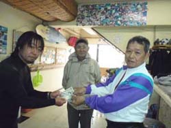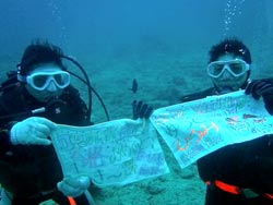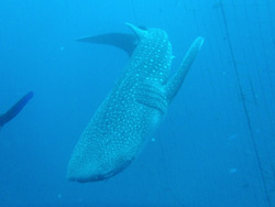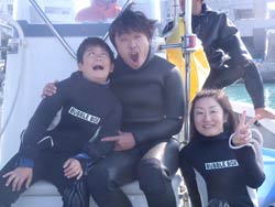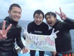 はいはーい!ども、わんたん&りょーけんでっす。今日はジンベイザメに会いに行ってきました〜!今回のゲストは昨日に引き続いての林さん親子!!ソウイチロウはまだ体験ダイビングなので網の上からジンベイウォッチング!えさに釣られて上ってくるジンベイを見ながら、もらったエサで餌付けもしていましたね。途中でジンベイに張り付いているコバンザメを掴みに行ったりもしてました(笑)お母さんのほうは網の中でジンベイと一緒に泳ぎまわりました!途中で網に引っかかるというアクシデントもありましたが、正面から向かってくるジンベイを触ってみたり餌付けをしてるソウイチロウを写真に収めたりしていました!今年も沖縄の海を満喫してくれた2人でしたが、また来年も海の中を楽しみに来て下さいね!! |