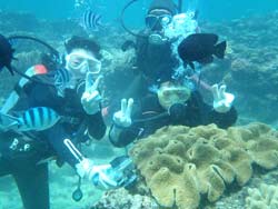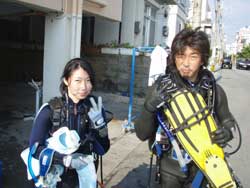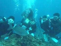 はーい!どーもーワンタンでーす!今日は砂辺で体験ダイビング!!一緒に潜ってくれたのは〜中西さんチームのみなさんでーす!!みんなはじめてだったので若干緊張気味でしたが(笑)。真剣に説明をきいてくれたので、海の中にみんな入ることが出来ました!!海の中を散歩したり〜、サンゴを見たり〜、写真もバシバシ撮ったよね!!でもやっぱりメインは・・・ニモ!!可愛かったでしょーー!!皆ががんばってくれたので見る事が出来ましたね!!最後は魚にご飯をあげながら戻って来ました!!ちょっと寒かったけど次回は夏にでも皆で挑戦してみてね☆★ |