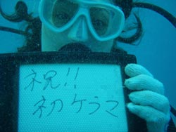 え〜本日、新しいダイバーが誕生しました!亀田さんこと、亀ちゃんです!!講習初日は奥武島へ。水温18度!極寒の中でスキルの練習をしました!!・・・亀ちゃん、なぜそんなに上手なんですか?!しかも!苦手スキルNO、1と言っても過言ではない「マスク脱着」を普通にこなし、フィンピボでは、指定された高さでピタッと止まれてました!・・・亀ちゃん、何者ですか??(笑)続いて講習2日目は、我等がSUNABEにて行いました〜。初日とは違って、たくさんの魚に囲まれながらのスタート^0^2日目も順調に進んでましたが、この日一番は何といっても「オクトパス浮上」!!あのエア切れの演技は、永久保存版です!モテモテなれますよ(笑)さぁ、そして最終日の今日。本日はケラマへ行って来ました!!!しかし〜、波があったのでチービシへ。少しユラユラしましたが、初ボートに興奮してましたね^0^1本目はコンパスを使っての講習〜!無事終わって、後はのんびり泳ぎ回りました〜〜〜!!穴をくぐってみたり、写真もムービーも撮りまくりました。そして講習最後を飾るラストダイブでは、ワンタンさんによる卒業試験!お題は・・・、レギュレーター・リカバリー!!しっかり見つけて・・・見事!ダイバーの仲間入りです^0^おめでと〜〜〜〜!!!ふり返ると、合格記念のハンカチが!ワンタンさんも、最高の顔芸で祝ってくれました(笑)さぁさぁその後は〜、遊びに遊び尽くしました!!船の上でバブルリングの練習をして、水中でやってみるとまぁ〜〜やらしぃ(笑笑)でも、スゴイのが一発キレイなワッカになって水面にとんでいきましたね!!やわらかいサンゴでは耳抜きの練習。とゆーか、ただの変態でした(笑)ずっと爆笑しまくり!!充実した最終日でした。・・・あっというまでしたが、ホントに合格おめでとうございます!!次回は、お酒に気をつけて体調を整えて来てください(笑)今度は彼女連れてきてください^0^今回は、ありがとうございました!! |
