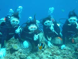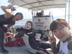今日新しいダイバーが誕生しました!近所のゲストハウスで出逢った、なっちゃんとりさちゃん!なっちゃんは水泳をやっていただけあって、めっちゃ上手で初日からナマコで遊んだりマスクを脱着しても余裕の表情♪りさちゃんはマスクの水に苦戦してましたが、他のスキルは上手にこなしていきました!そして迎えた最終日!!ポイントを移動して北部のゴリラチョップへ!砂地の広がる綺麗なポイントで、残りのスキルと泳ぎ方など、そして大嫌いなマスクを特訓して!2人ともメッチャ上手なダイバーになってくれました!水中では、可愛いクマノミ親子や砂に隠れていた大きなカレイ!!そして○○こ岩!!特になっちゃんは大喜び☆たっぷり泳いで遊んでラストダイブを終えました☆3日間本当にお疲れ様でした!りさちゃんは沖縄に来たらまた遊びに来てください!もちろんるなちゃんと♪そしてこれから沖縄生活が始まるなっちゃんは、ガンガン潜りにきてね!またお待ちしてます!! |