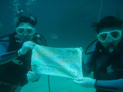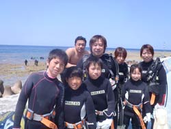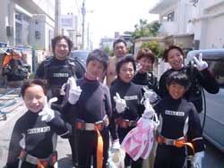 はーい!どーもーワンタンでーす!今日は砂辺でビーチ体験ダイビング〜!!一緒に潜ってくれたのは〜ヒデヤさん!サチコさん!リュウハ君!さとみさん!はやて君!ライハ君!ルウちゃんでーす!子供チームはワクワクしながら!大人チームはドキドキしながら〜練習をして〜(笑)。皆見事にお魚さんに会える事が出来ました☆メインはやっぱりニモ!!かわいかったでしょー☆★魚にご飯あげる時は魚にKISSされてる人もいましたね(笑)。子供チームは楽しみながら!大人チームはドギマギしながら海中散歩もして、最後はワンタンの一発芸!おぉぉ!上手くいってよかったぁ☆★今日は皆楽しかったかな??また皆で旅行にいった時は沖縄に遊びにきてくださいねー!!待ってまーす!! |
