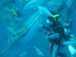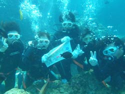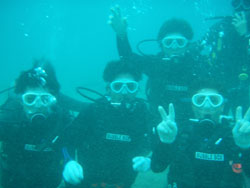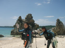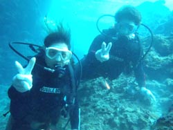 ども!タクです!!今日は、真栄田岬へ体験ダイビングへ行ってきました!!!一緒に行ったのは〜、一人旅行中の若ちゃん。陸上での練習を終えて、レッツラゴ〜!水中では、少し緊張していて慣れるまでちょっとかかりましたが、途中からは全然上手に泳いでました!洞窟の中は貸切で、「青」を独り占めできましたね^0^帰り道では、エサをあげたり、写真を撮ったりして楽しみました!!ラストは、一発芸のバブルリングでしたが・・・、若ちゃんがちょうどマスククリアした時だったので(笑)最後ぐらいしか、見れませんでしたね(爆)また次回、一緒に潜りましょう!! |