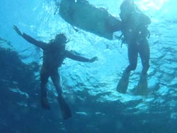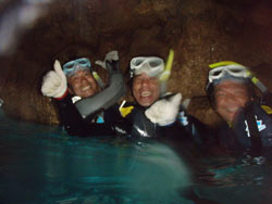 ども!!天気は晴れ、俺の大好きな真栄田もオープン、海況もまぁまぁ良いという本日、元気よく体験ダイビングに行ってきました〜〜!!一緒に潜ってきたのは、ギャップ&マリリン^0^・・・、日本人です(笑)今回は、Wコース!スノーケルとダイビングの両方で、洞窟を泳ぎ尽くすとゆ〜超豪華なコースでございます!!!まず一本目は、スノーケル。最初は歩いて洞窟の中から出発!!奥まで進んで壁とにらめっこ(笑)そのまま進んで〜振り返ってみると〜。実際、見てみないとわからない美しさってヤツですね^0^お次は洞窟を出てエサあげ!・・・一人かなりビビってました(笑)スノーケル終わって休憩をはさみ〜、続いてダイビングの説明。耳抜き、呼吸バッチリ異常なし!!とゆーことで、スイスイ水の中へ入っていけました!!2人ともまぁ〜〜上手!!洞窟に着いて入り口を見ると、スノーケルとは違った青が見れましたね!帰り道では、クマノミさんに挨拶!イソギンチャクの感触はどうだった??(笑)最後は、一発芸!バブルリング、できて良かった〜。 |