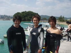はいさ〜い、せーやです!今日この天気のいいなか遊びに来てくれたのは、東京からお越しのマッチョ3人組みです☆3人とも終始コントな感じでめっちゃ笑いがありました^^ダイビングの説明の時も矢野さんがちょいちょいダイビングについて知っていて、それをみんなに話す姿がおもしろかったです。水中では矢野さんは寒くて震えていましたが・・・、丸山さんと嶋崎は全然感じていなく普通にスイスイ泳いでましたね♪最初はカクレクマノミのニモを見てソフトコーラルのいっぱいあるところの上をみんなで泳ぎましたね!!途中ナマコ事件はうけました(笑)最後に大量のお魚にエサをあげましたね。矢野さんは脂肪をもっと蓄えて挑戦しに来てくださいね^^(笑)みなさん機会があればぜひライセンスも取ってみてくださいね!!!また来てくださいね〜☆ |