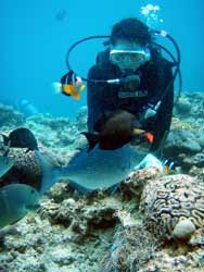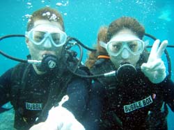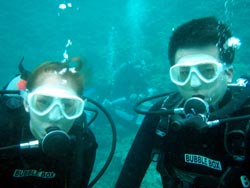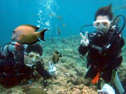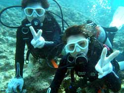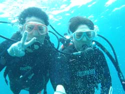 はーい!どーもーワンタンでーす!今日11時からお越しいただいたのは〜タクヤさん!アヤカさんでーす!タクヤさんは落ち着いていましたが・・アヤカさんの緊張はMAX!!まずは陸の練習からそして〜足の着く所での練習!水中世界を覗いて〜魚を見て見たら緊張がほぐれてきましたね!そうしている間に洞窟に到着!!青い光を浴びて〜帰りはちょっと魚を見る余裕ができてきましたね!クマノミは可愛かったでしょー!!魚にエサをあげるとすごく寄って来たしね・・(笑)。次回はカメを見に行きましょうね〜!! |