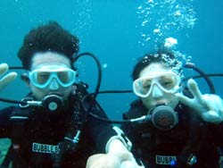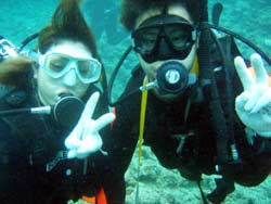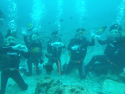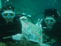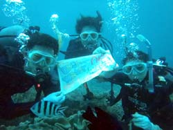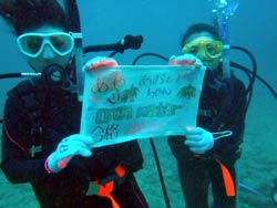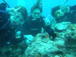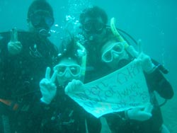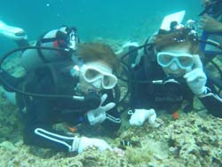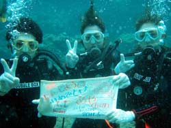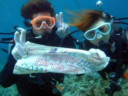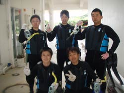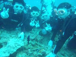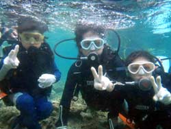 今日はいつも遊びに来てくれるひとりんからの紹介でにぎやかな3人組がダイバー仲間入りですよ!メンバーは 神奈川からジョージ、バブゥ〜、ゆみちゃんです。 初日から 耳がこれで あれでこれなもんで!!でしたが がんばりました。笑 学科も海も楽しかったね。肺の使い方や泳ぎ方などなど、海の中では とっても上手かった3人でした。でも それよりよかったのはノリが めちゃめちゃ良かったです。うるさいぐらいに・・・・そんな 3人が今日 無事にオープンウォーターダイバー合格です。 パチパチパチ・・・おめでとう。夜はバーベキューも楽しく盛り上がったね。次回また沖縄の海で 待ってるよ!そうそう コトー先生にもよろしくね。楽しみにまってますよ〜〜!かっこいいダイバー 可愛いダイバーめざして これからも楽しんでください。そして 仲間もいっぱい作ってね! |