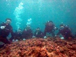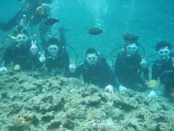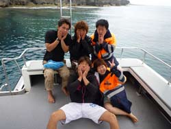今日2組目は 夕方飛び込みで遊びに来てくれた元気と根性で生きている、男の子5人組です。スノーケルかダイビングかを悩んでいましたが 思い切ってダイビングに挑戦です。時間がないので結構あわてて説明しましたが みんなしっかりと説明を聞いてくれました。呼吸の練習では1人ドキドキしていましたが、無事全員潜る事ができました。水中ではニモを見に行ったり、柔らかサンゴを見たり餌付けでも、魚を捕まえようとしている人がいたりと、ワイワイと楽しみましたね。スノーケルにするか悩んでいましたが、1人の男の子のゴリ押しでダイビングにしてよかったと、帰って来てから皆喜んでいました。5人ともとっても上手に泳ぐ事が出来 楽しそうでした。次回もまた 会えるのを楽しみにしています。次回は 青の洞窟に行きましょう。5人なら楽勝でいけますよ。待ってますね〜〜! |