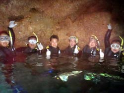 はいはーい!ど〜も、りょーけんでっす!続いての体験ダイビングは前回ワンタンさんと一緒に潜ったかんちゃんとみのちゃん!この2人と青の洞窟に行ってきました〜!かれこれ体験ダイビング5回目ということもあって潜るのにまったく不安も無くスイスイといけましたね!周りを泳ぐ魚を見ながら進んでいくとあっという間に洞窟に到着!奥から見る洞窟の青はとってもキレイでしたね。ゆっくりと青を見ながら戻って帰り道では魚に餌付けをやってきました!餌付けも慣れたもので魚に触ろうと手を伸ばしてました!!最後のバブルリングもバッチリ成功してとてもキレイでしたね。また沖縄に来るときは一緒に潜りましょうね!!それともライセンスコースにチャレンジしてもいいかもしれませんね! |