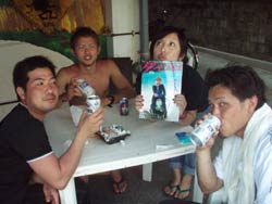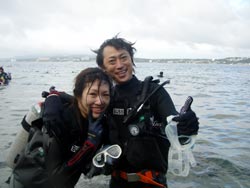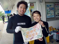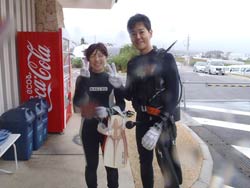はいさい!今日は久しぶりに、ひとりんが遊びに来てくれました。なんとなんと今回は彼女持参で!!^0^とっても可愛い彼女さんは今回は体験ダイビング!ドキドキしているようでしたが陸での説明をして、前回グアムでの体験ダイビングとは違い、自分で泳ぐ練習をしました。呼吸で浮き沈みを少し解り始めたころにはすっかりダイバーさんのようでしたよ。ひとりんは一生懸命水中写真を撮っていて、とってもとってもいい彼氏です。ひとりんありがとうね!いい写真があれば送って下さい。海日記に載せます。最近はゴルフの回数が多くなってきたようですが、せっかくダイブマスターまで持ってるんだからダイビングも楽しんでよ。彼女にもライセンスゲットさせよう〜〜!そしてまた、待ってるよ!! |