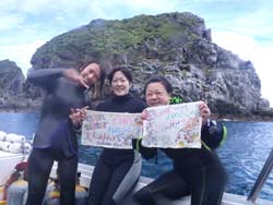 はいはーい!ども、りょーけんでっす。今日は体験ダイビングに行ってきました!!今回のゲストは愛知からお越しのミツヨさん、ユカちゃん、トモちゃんの3名です。このメンバーで青の洞窟まで行ってきました〜!最初は緊張でガチガチでしたが、目の前に集まる魚を見ていたら緊張も解れて行きましたね!洞窟の奥から見た青の光は感動的でしたね。今回はみんなからコメントを頂いているので掲載させていただきます。 ☆ミツヨさん:初めてのダイビングでしたが、お兄さんの誘導で安心してダイビングが出来ました。青の洞窟もきれいに見れて感動しました。ありがとうございました。 ☆ゆかちゃん:今日は、雨が降っていてダイビングが出来るか心配してたけど、とってもキレイな青い海の中が見れて感動しました。クマノミとかエビとかいろいろキレイな海の中の生き物がいてとっても嬉しかったです。ダイビング初めての私達に親切丁寧に教えてもらってありがとうございました。またいつか来たいと思います。 ☆トモちゃん:海の中に入る前は緊張しましたが、実際に入ったら、事前に行った練習のおかげで初めてのダイビングを楽しむことが出来ました。分かりやすく教えていただいたので初めてでも恐く無かったです。ありがとうございました。 以上です!!また沖縄に来たら次も一緒にもぐれたらいいですね。沖縄の海で待ってますよ〜!! |