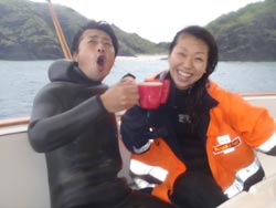今日の体験ダイビングは飛び入りで参加してくれた、モアちゃんとタカさん!上手に潜ってくれました!たくさんの魚に夢中になりすぎて、こっちを見てくれない瞬間が多数。。。(笑)それくらい楽しめたようですね!お2人からコメントを頂きました♪ モアちゃん:先生方がとても親切で楽しく指導してくださいますのでENJOYしっぱなしでダイビングできますよ。私は久し振りのダイビングだったのですが、安心しておまかせできました。 たかさん:シゲさん、セイヤさん、今日はありがとうございました。初めてのダイビング とても楽しかったです。とても親切で楽しませてくれるエスコートして頂きありがとうございました。チャレンジして本当に良かったです。 また是非遊びにきてくださいね!水納島も楽しめましたか? 今日はありがとうございました! |