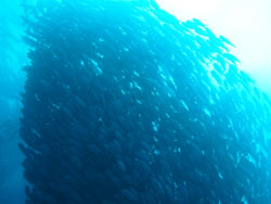 まいど〜ひろあきです!!今日は久しぶりに粟国島へ行ってきました☆やっとこの季節がきましたよ〜♪粟国島といえば・・・なんと言ってもギンガメアジのトルネードが見れるんです。毎年この時期になるとどからともなくやってくるギンガメの群れを追い求めてケラマ諸島を飛び越え行ってきました。一本目は海況を考慮してさくらでエントリー!!ここのポイントは地形が魅力でクレバスがいくつもあり、そこに大量に群れるハナゴイ!!紫色の綺麗な体がヒラヒラ綺麗でしたよ〜☆そして浅瀬のサンゴを見ているとちょっと小さかったけどナポレオンを発見!!最近大物を見れてなかったんで個人的に大興奮しました(笑)それから二本目はメインの筆ん崎へエントリー!ギンガメの群れを探しながら根の周りをグルグル回っているとめちゃくちゃ小さいナンヨウハギがサンゴの隙間に必死に隠れているのを発見^−^近づいてもぜんぜん逃げないのでかなり近くで観察できました♪でも肝心のギンガメの姿が・・・?いない。。探して探して探したけど見れなかったのでしょんぼりしながらフロートをあげて安全停止をしていたら目の前をギンガメが!!!でも10匹ほどの小さな群れでした(泣)でも近くで見たという情報があったのでお昼ご飯をとらずに3本目にエントリー!情報があったところを探しながら泳いでいると今度は巨大なポレオンを発見!!1,5メートル級でかなり迫力がありました☆期待しながら泳いでいると潜水時間30分頃に巨大な塊を発見!!!大興奮でアドレナリンマックス(笑)綺麗な玉になってグルグル回っているギンガメをみんなで囲んでカメラでパシャパシャ!!全然逃げずに僕らの前で泳いでくれていました。いや〜ホントによかったよかった^−^これで引退せずにすみました(笑)興味がある人は是非遊びに来てくださいね♪ |