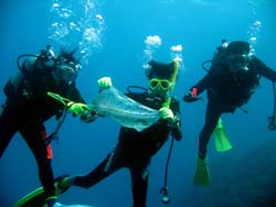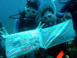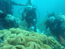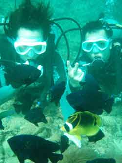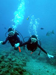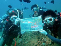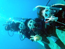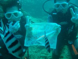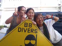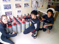 はいさ〜い!4名でのファンダイビングですが、本日2名の若きダイバーが誕生しました。その名も「2人の裕美」です。一人目の裕美さんは へいちゃん!ここ10年近くは海につかる事がなかったと言うへいちゃんは 初日からかなり緊張気味・・・大変よくがんばりました。笑!マスク脱着も耳抜きも レギリカも全て緊張していましたが、ワシも鬼になり、何度も何度も慣れるまでは練習しましたね。そのかいあって最後は魚を追いかけるほど余裕になって、立派なダイバーになりました。その相棒みゆきちゃんは初めて一緒に潜ったけど、とても落ち着きへいちゃんを見守っていましたね。これからもへいちゃんをよろしくね。みゆきちゃん、また一緒に潜りましょう。そして二人目の裕美さんは、ひろみんです。お馴染みひとりんとのペアーです。ひろみんは以前一緒に体験ダイビングをしたけど、ビックリ仰天です。とても美味かったですよ。若干体力に問題ありですが、これからはひとりんという力強いバディーが居るので安心だね。海の中では、呼吸でホバーリングもなかなか理解していたようで、以前の体験ダイビングをした時面影は全然無く、ワシは感動したぞ!これからもダイビングを楽しんで下さいね☆『OW合格おめでとう!!』 |