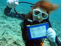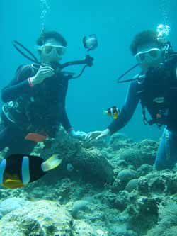 本日ラストはお昼に沖縄入りしたひろちゃん&ゆっこ☆ひろちゃんは5年前にダイビング経験あり♪でもお久しぶりなのでゆっこと一緒にゆっく〜り行ってきましたぁ!!でも深い所を見たらちょっぴりドキドキ(><) ゆっこは心配していた耳抜きも意外と上手にこなして水中世界へ!!お魚さんにいっぱい囲まれてきましたぁ♪いろんな種類のお魚やサンゴが広がる世界はと〜っても素敵でしょ(0^^0) ではお2人からのコメントで〜す!! ひろちゃん☆今回はちょっと残念でしたが、まためげずに次回もバブルボックスで挑戦したいと思います!!ありがとうございました☆ ゆっこ☆初ダイビング、最初は耳抜きが出来ず、果たしてホントに潜れるのか心配でしたが、サンゴやクマノミとかも見れて海の中すっごく綺麗でした!!またぜひ挑戦したいです☆やわらかサンゴとかヒトデとかたくさん触れて良かったです♪ もっといろんな景色の水中世界があるからまた挑戦しに遊びに来てね(0^^0) 次こそ2人揃って水中記念写真撮りましょう♪待ってるよ〜(^^) |