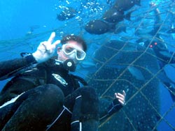 まいど〜ひろあきです!!今日は久し振りに世界最大の魚類と言われるジ・ン・ベ・イザ・メに会ってきましたよ〜!!!!一緒に行ってくれたのは昨日から引き続いて体験ダイビングに挑戦の岩ちゃん!!初のボートダイブにも挑戦です!!マンツーマンだったのでかっこよくバックロールエントリーで決めてきました!!海は凪で透明度もまずまず!!入ってすぐにでてきました・・・。やつが・・・。相変わらずでかい!!!まじでかいっす!一番大きいのは体長7mです。全部で3匹います。網の上の近くで餌付けをしてくれるのでかなり間近で観察できました。いやむしろ手を伸ばして触れました!!サメ肌気持ちかったでしょ〜??今度はライセンスとって網の中で一緒にジンベイとたわむれましょう〜♪また遊びに来てくださいね!! |